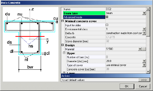 IMPORTANT: This item specifies number of bars of BASIC REINFORCEMENT. Basic reinforcement is present in the member under all circumstances. All functions in service Concrete Advanced assume that this basic reinforcement already exists in the designed members and any calculated required reinforcement is an addition to this basic reinforcement. This item enables the user to define the assumed number of bars at the top and bottom surface. This number is considered during the design. The design is carried out for a beam that already contains this defined reinforcement and the final necessary reinforcement area means the reinforcement that must be added to this assumed reinforcement. See note below. |