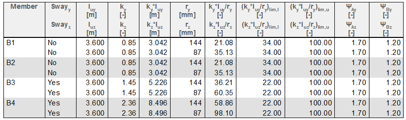 In the table below are calculated slenderness ratio for sway and non-sway member with restrains in both ends and one end too (member B1 – non-sway column restrained in both ends, B2- non-sway column restrained at foot of the column, member B3 –way column restrained in both ends, B4- sway column restrained at foot of the column ).
