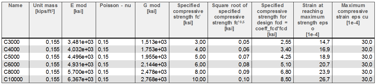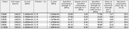 These are several predefined concrete materials in the material Library. These materials are according to code ACI-318R-05. The following table shows materials with their code dependent properties.