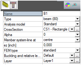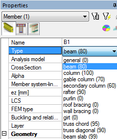 - Beam type – combobox; type of member; there are 3 possibilities – beam, column, slab