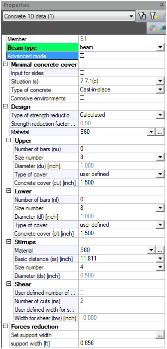 Concrete member data for beams can be defined in two modes. Basic mode is when checkbox Advanced mode is OFF. The advanced mode ON can be set by user. The several additional properties are possible to edit for advanced mode.