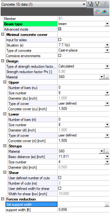 The difference between member type “beam” and “beam as slab” is the “beam slab” doesn’t include properties related to shear reinforcement. The value “number of bars” used for the member “beam” is replaced by the item “Bar distance” for member type “Beam slab”