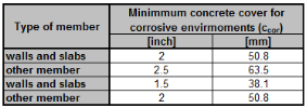 - Corrosive environments – the basic rules for minimum concrete cover for corrosive environments are defined in code ACI 318-05, clause 7.7.5