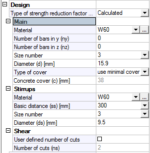 - Number of cuts – editbox; number of stirrups legs used for the calculation of stirrups area; editable only if User defined number of cuts is set ON
