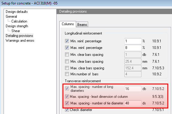 - Basic distance – it is basic spacing of the transverse reinforcement in column. It means, that minimum spacing of transverse reinforcement (see chapter "8.2 Design of reinforcement for 1D members (beams, beams as slab, columns)") is calculated as minimum value of this value and of the values defined in detailing provisions in concrete setup ( Detailing provisions >Columns >Max. spacing, see picture below ). The basic distance will be not taken into account if zero value is set.