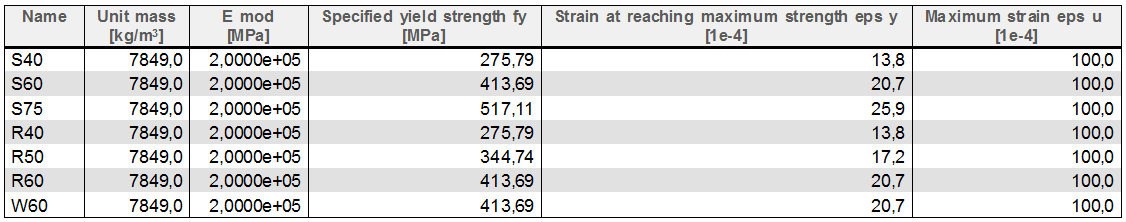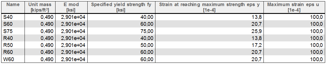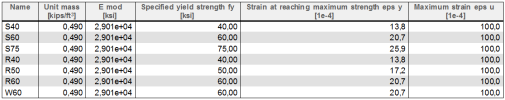 These are several predefined reinforcement materials in the material Library. These materials are according to code ACI-318R-05. The following table shows materials with their code dependent properties.