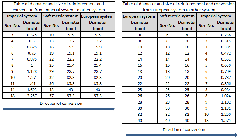 Size and diameter of reinforcement and way of conversion among measuring systems are in tables below.