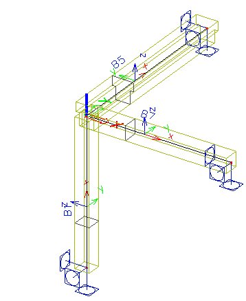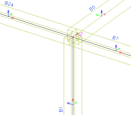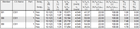 Input data: Compression member (B1): Iy = Iz = 5125,35 inch4, E = 4032 ksi, redc = 1 (EIy)c =(EIz)c = 20665411 kip·inch2, lc = 13,123 ft Flexural member (B7): Iy = Iz = 5125,354 inch4, E = 4032 ksi; redb = 1 (EIy)b = 20665411 kip·inch2, lc = 13,123 ft α = 180 deg; β = 0 deg Flexural member (B5): Iy = 20968,3 inch4, E = 4032 ksi; redb = 1 (EIy)b = 84544185.6 kip·inch2, lc = 16,404 ft α = 90 deg; β = 0 deg