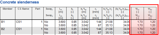 The values ψ about both axis’s and in head and foot of compression member are presented in numerical output of the service Concrete slenderness