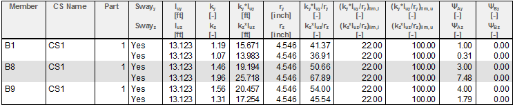 The effective length factor can be calculated according to clause 10.12.1 in ACI 318-05. The calculation of this factor depends on ratio of stiffness of compression members to a flexural members in plane, which are joined to head ( ψAy(z)) and foot ( ψBy(z)) of calculated compression member. These ratios can be input directly by the user via columns Psi A yy(zz) and Psi B yy(zz) (if Calculation Psi yy(zz) = Input ) or can be calculated automatically by the program (if Calculation Psi yy(zz) = Calculate )