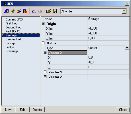 The UCS manager gives the user full control over the existing user co-ordinate systems. Similarly to other database managers, it provides for the definition of a new UCS, for the modification or copying of existing systems, and for removal of no-longer-used co-ordinate systems.
