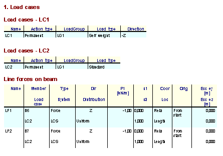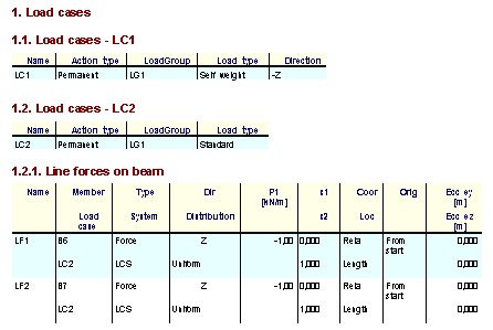 That is: Load cases, Line forces on beam, Load groups and Combination