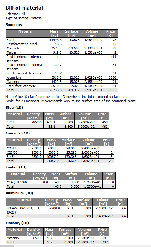 Note: Please notice, that Surface value in the bill of material represents a different quantity for both type of members: for 1D it means total exposed surface while for 2D it corresponds to the surface area of the centroid plane.