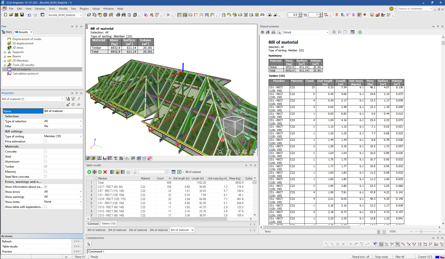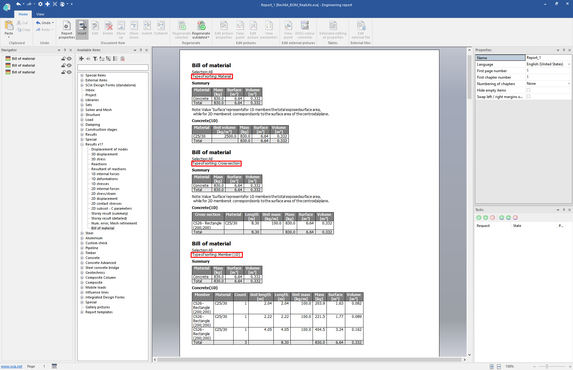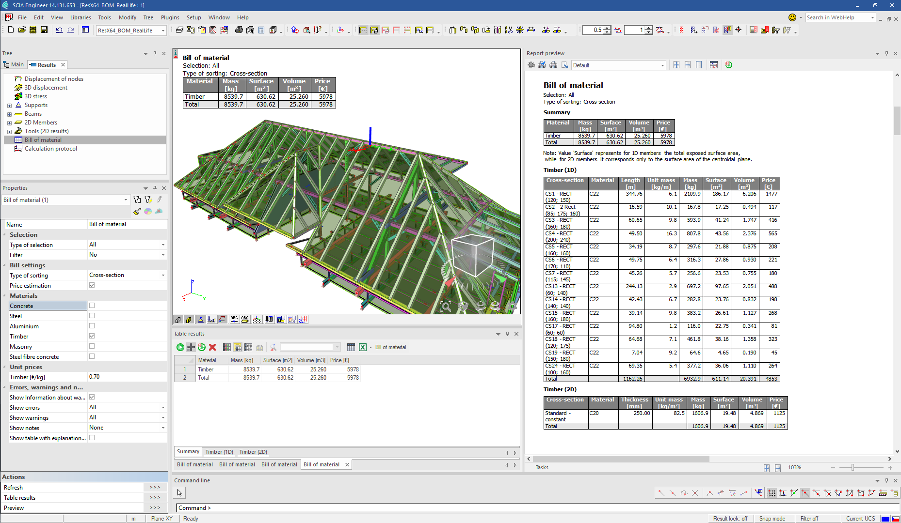 A calculation of the BOM results (mainly mass, surface and volume) takes into account the real geometry of the members including haunches, arbitrary profiles or multi-material cross-sections in case of 1D members and variable thickness, composites and members with subregions and openings in case of 2D members. The presentation of results is provided in the standard way using Preview or Table Results application windows. The numerical output (in tabular form) is arranged according to the selected type of the filtering (per material, cross-section or member) for which the results are calculated for 1D and 2D members separately. The total values of the quantities are presented than for both types together in the "Summary" table which is presented at the beginning of the output.