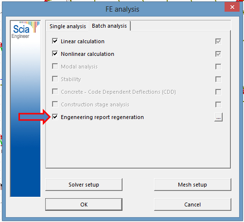 In the dialogue of Batch analysis it is possible to select also some of existing reports to be regenerated at the end of analysis. This possibility enables to run finite element analysis and regeneration of selected reports in one step (e.g. during the night or lunch pause). After finishing those tasks user can immediately start checking up-to-date results of analysis and checks in updated engineering reports.